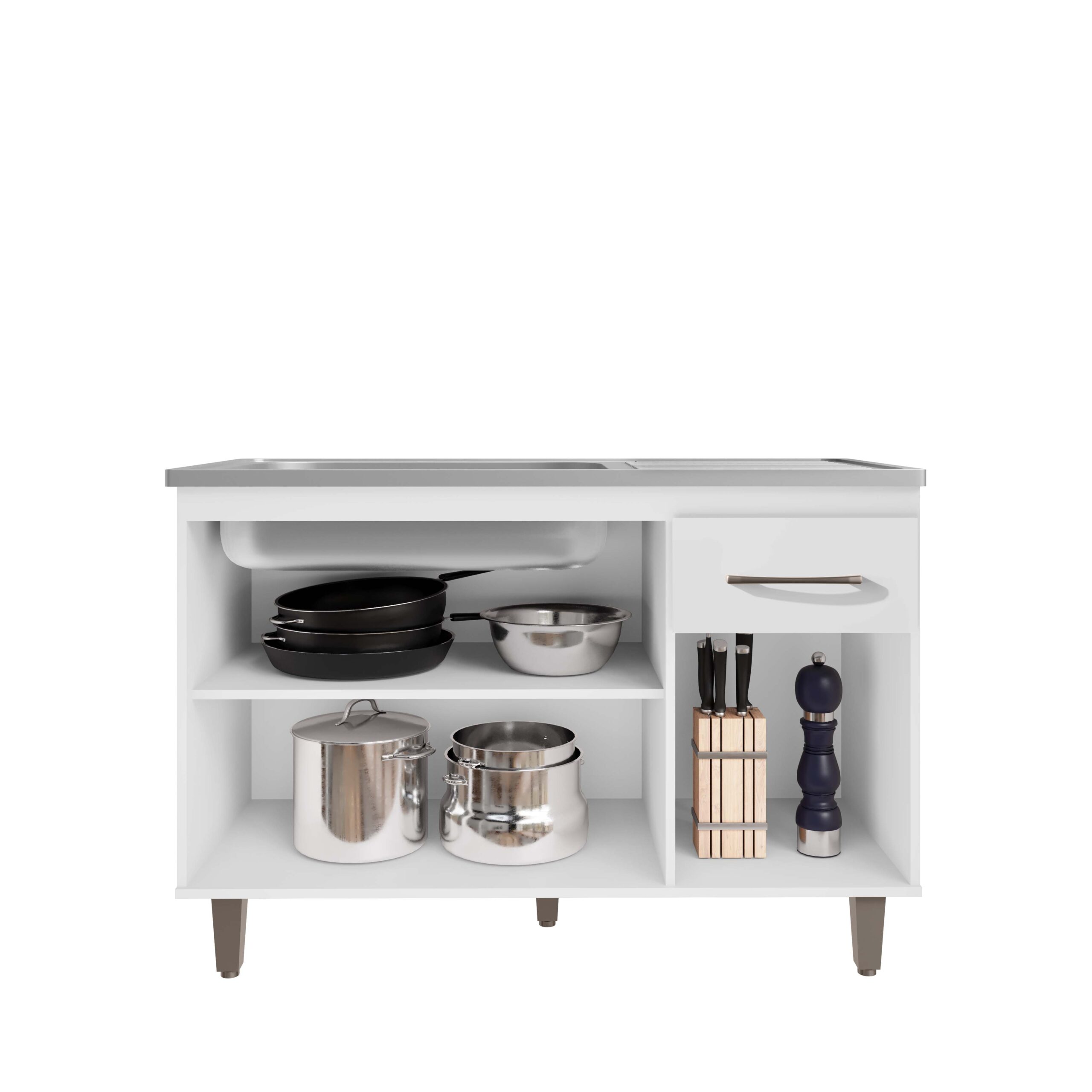 • Produto em MDP 12mm • 02 Portas articuladas • 01 gaveta externa com corrediça metálica • Puxadores em PVC • Pés em PVC com regulagem Altura: 82cm Largura: 118cm Profundidade: 50cm