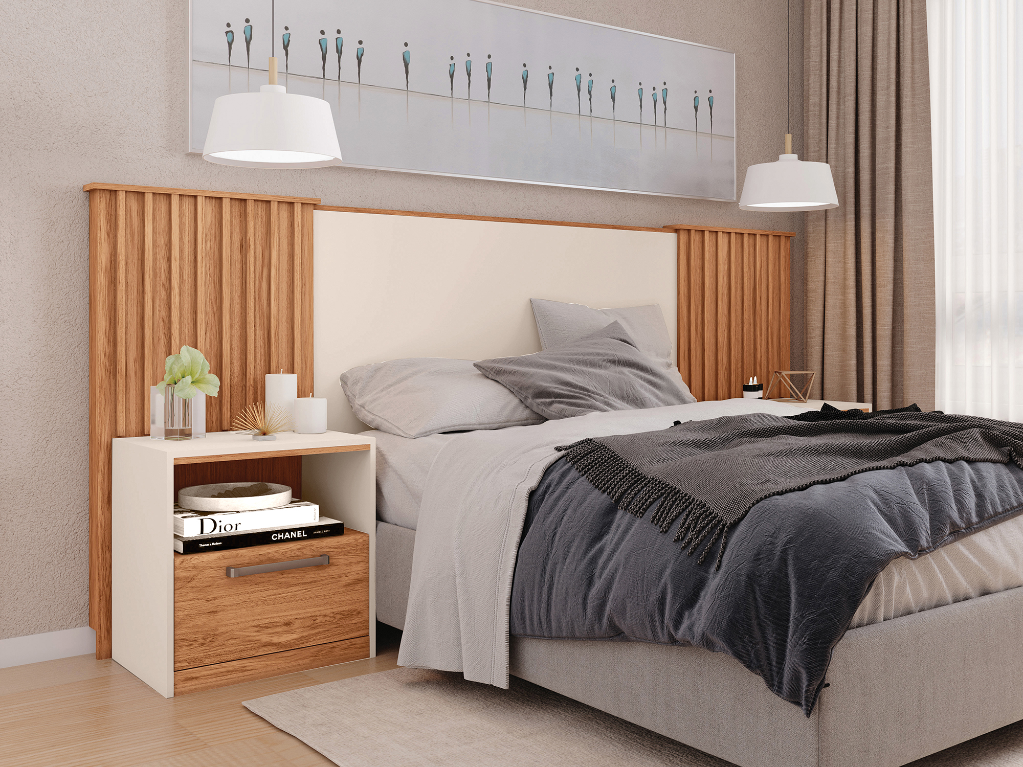 Cabeceira com Criado Produto em MDP Produto Extensível Altura: 118,3cm Largura: 268cm Profundidade: 44,8cm Outras Larguras: 325,6cm e 287,2cm