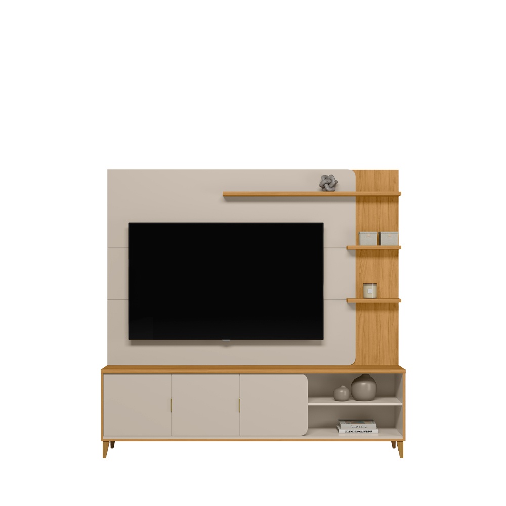 3 Porta de abri com Detalhe Arredondado 3 Prateleiras de 25mm Pés em Madeira Maciça Ideal para TV de 70″ Altura: 193cm Largura: 200cm Profundidade: 43cm