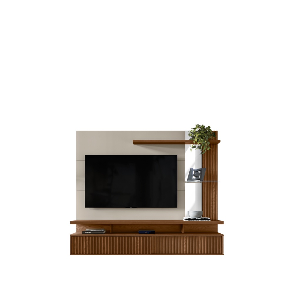 Porta de Correr Ripada Painel Ripado + Prateleira de Vidro Tampo de 37mm Ideal para TV de 60″ Altura: 154cm Largura: 182cm Profundidade: 32cm
