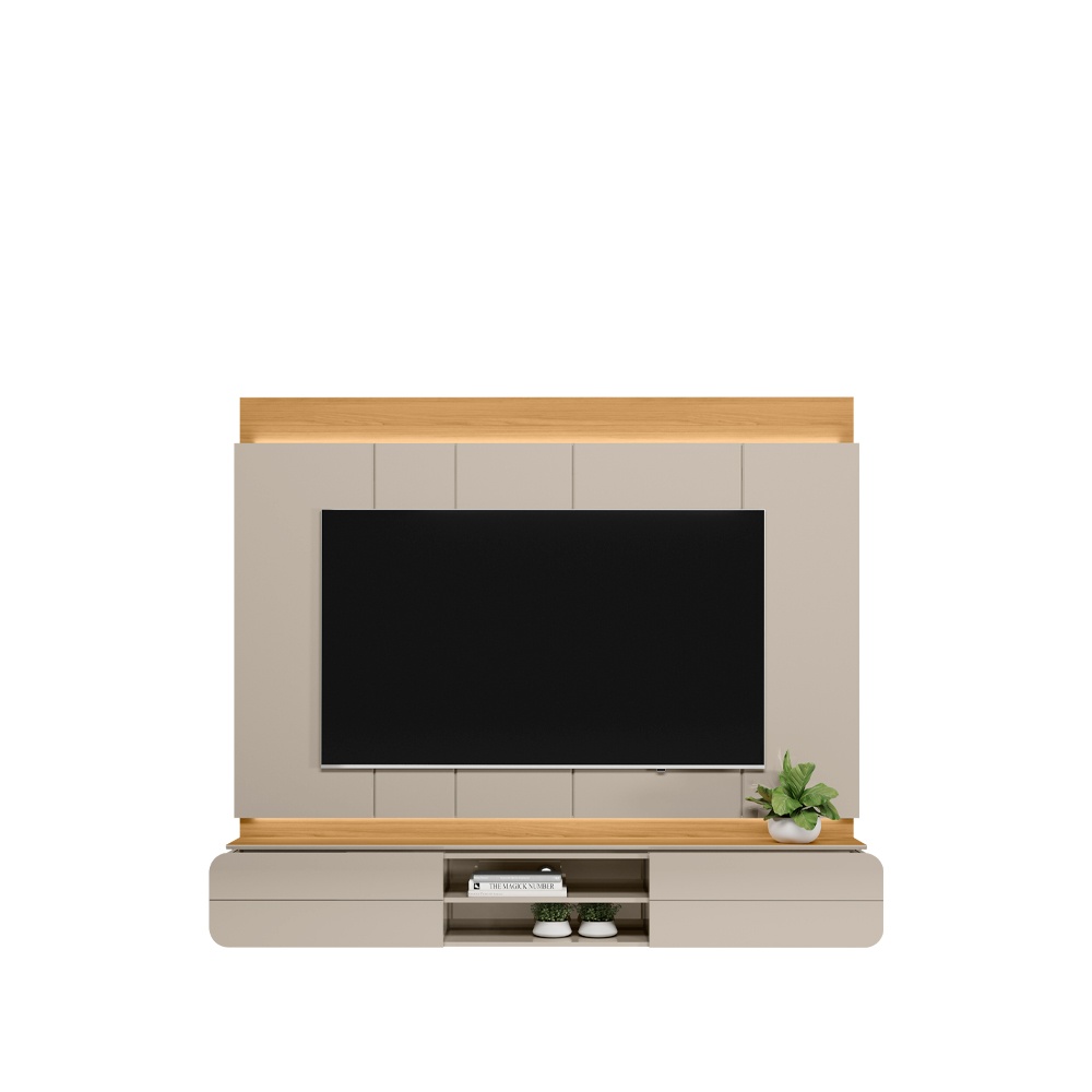 Painel com Detalhe Chanfrado Detalhe Curvo Porta Basculante com Frisos, Acabamento Chanfrado e Detalhe Arredondados Tampo Suspenso com Detalhe Chanfrado Ideal para TV de 75″ Altura: 173cm Largura: 200cm Profundidade: 32cm