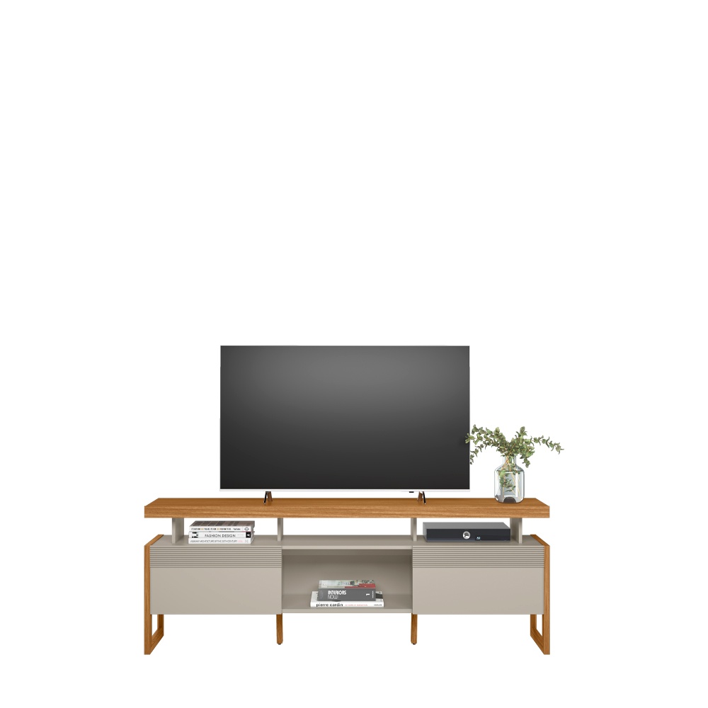 Espaço para decoração e aparelhos eletrônicos Pés com moldura Porta de Correr com Detalhe Ondulado Ideal para TV de 70″ Altura: 66cm Largura: 180cm Profundidade: 36cm